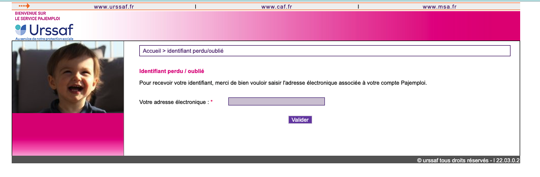 Pour une première connexion, connectez-vous au site pajemploi en utilisant un identifiant et un mot de passe. Ces identifiants de connexion sont directement visibles au niveau de la notification d’immatriculation.